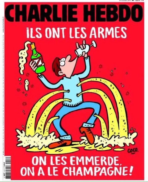 The latest cover of Charlie Hebdo, a defiant satirical French newspaper say "They have weapons. Screw them, we have champagne," The Newspaper was the focus of attack in January where the Editor and some senior staffs were killed during a meeting.