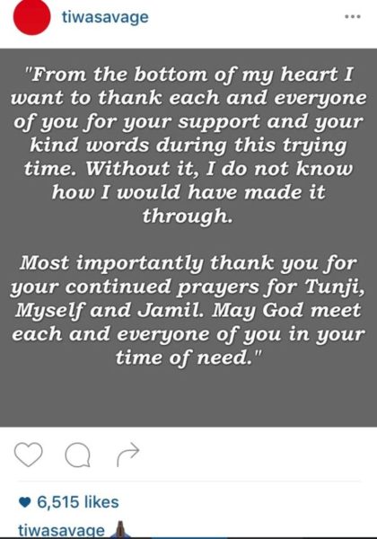 Singer Tiwa Savage make a return to social media after days of absence following her husband suicide attempt, she thanked her fans for their support in the past trying days