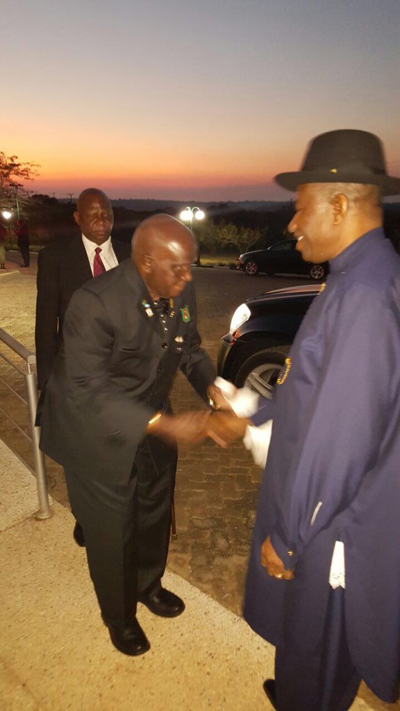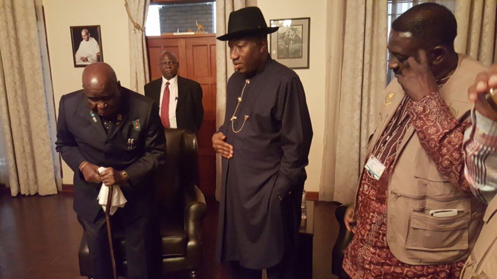 Former President Goodluck Jonathan was today received by Zambia first President Kenneth Kaunda as he arrived as AU Head Election Observer