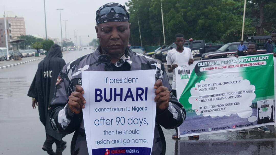 A sit out protest commenced in Abuja Today led by Charly boy and others asking President Buhari to either resume or resign after staying away from the country for 90 days. more photos